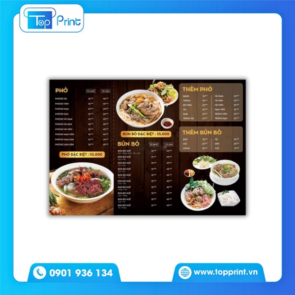 Tại Topprint, chúng tôi không chỉ cung cấp dịch vụ in menu chất lượng cao, mà còn hỗ trợ thiết kế menu theo yêu cầu, đảm bảo đúng phong cách quán – đúng giá trị thương hiệu.Hãy liên hệ với Topprint ngay hôm nay để được tư vấn và sở hữu mẫu menu phở ấn tượng, độc quyền dành riêng cho bạn!