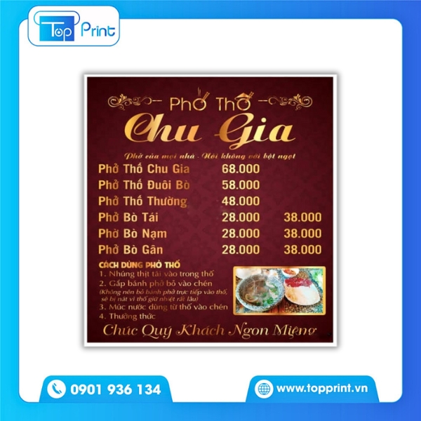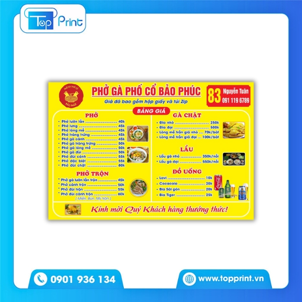 Liên hệ ngay với Topprint để nhận báo giá chi tiết và tư vấn thiết kế menu quán phở ấn tượng nhất!
